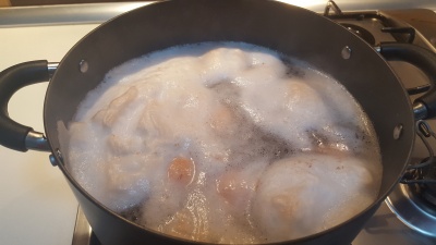 Vodu je nakon kuhanja potrebno ohladiti i nakon toga u nju staviti prethodno kuhana jaja i ostaviti da stoji preko noći. Ova jaja nisu bila izbljeđena iz razloga što su mi neka jaja kod izbjeljivanja popucala i pojeli smo ih za večeru.