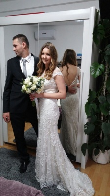 Vjenčanicu sam uzela također u salonu u koji sam došla na prvu probu. Inače isprobavanje vjenčanice se plaća 70 kn, ako kapariš odmah proba se ne plaća. Iskreno da nisu imali tako simpatičnu prodavačicu koja se zbilja trudila, otišla bi po haljinu na drugo mjesto. Kvalitete tih haljina su upitne, sve su made in China. Obučeš haljinu 10 perlica momentalno padne s tebe. Na probu obavezno povedite mamu i prijateljice. Vi neće vidjeti sva oštećenja, haljinu iz svih kuteva, ali one hoće. Povedite si nekoga tko je iskren i dobro namjeran. Isprobajte različite modele, moguće je da će vam super stajati sirena kroj iako ste se namjerili na velike princeza haljine, uzmite si vremena i isprobavajte. Prava haljina će naići, a to ćete primijetiti čim ju obučete. Meni je bilo iznenađenje da se cijela haljina plaća u naprijed, prije preuzimanja. Kaparu sam dala u 9. mj, a ostatak iznosa 2 dana prije vjenčanja pa eto pripremite budžet i za to, mada kažu da se može dogovoriti i drugačije.