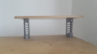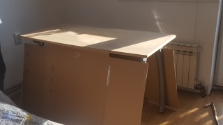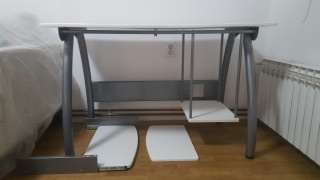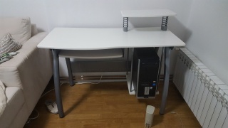 Stol je kupljen u Kiki ima već dosta godina, ali je prilično moderan zbog ovih metalnih dijelova. Tijekom svojih kreativnih trenutaka, još prije par godina, zarezala sam ga sa skalpelom, nakon toga skinula sam oštećenu tapetu s velike i ove gore manje plohe za monitor. Prva ideja bila je da ću ga oblijepiti tapetom, taj pokušaj bio je još prije godinu dana..ispalo je grozno..stol nema ravne rubove i jednostavno je bilo nemoguće uredno ga oblijepiti. Tapeta je završila u smeću, a stol je čekao bolje dane nakrcan stvarima. Nakon što sam ofarbala radijator (vidi prethodni post) vidjela sam da je farbanje sprejem odlična stvar, brzo i efikasno..ipak u slučaju farbanja drveta baš i nije bilo tako jednostavno..