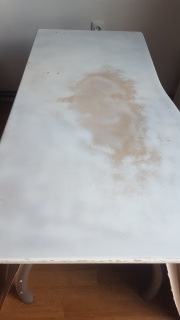 Prvi sloj ispao je grozno, već sam mislila da sam stol upropastila do kraja. Sve nekakve stare masne mrlje ili mjesta koja su bila izložena vodi i toplini nisu primale boju..sitna prašina se dignula i nakon što se osušilo, ponovno je trebalo izbrusiti površinu. Ovo drvo jako upija boju, pravi majstor bi ispod stavio temeljnu boju, ali ja jednostavno nisam imala vremena za to..sve to onda postaje pre skupo, a sprejevi su zakon.