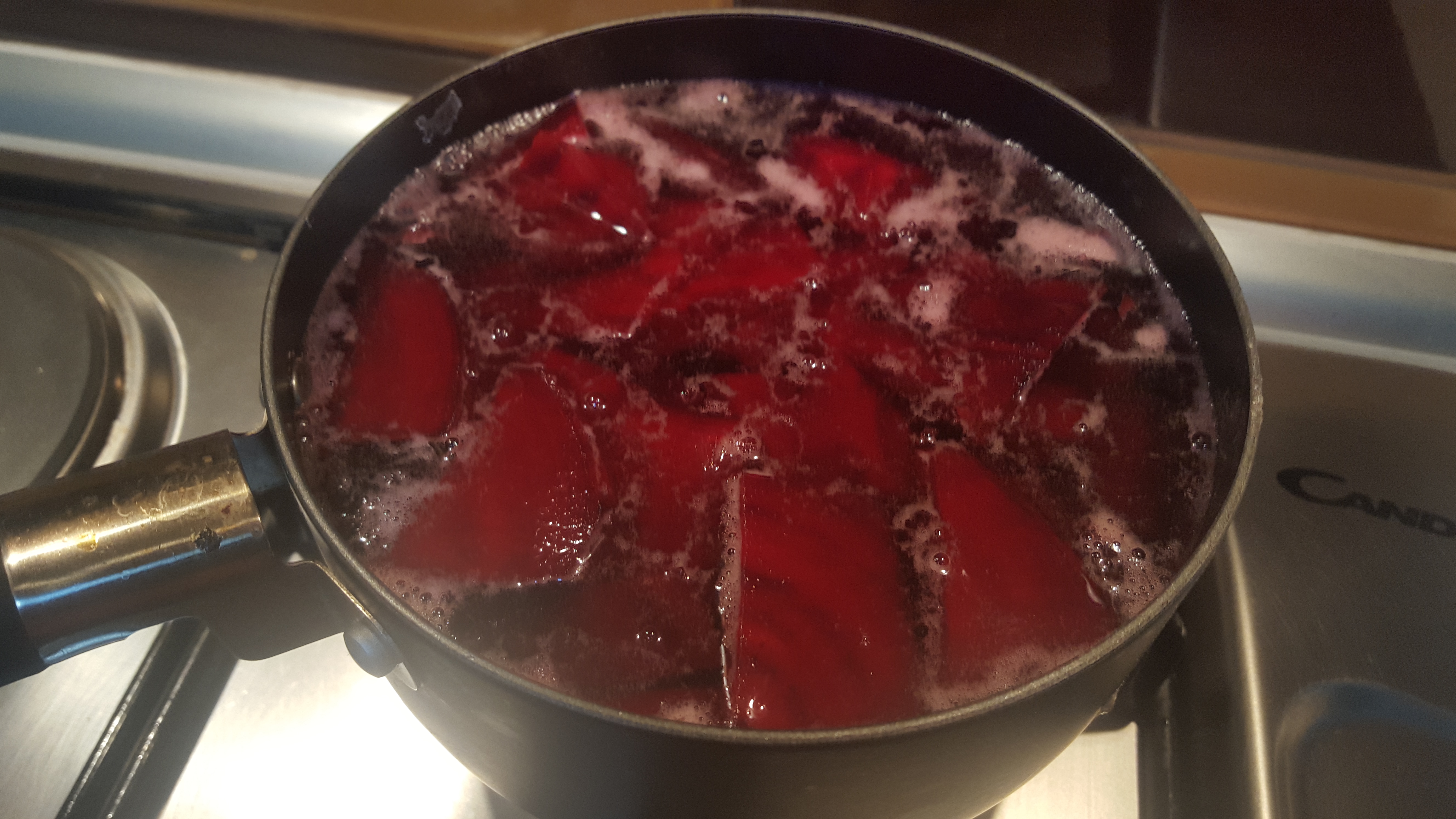 ovdje sam pronašla dvije varijante kako obojati jaja. Za oba postupka ciklu je potrebno oguliti i narezati na kockice. Staviti je u vodu da se kuha. U jednoj varijanti je da jaja kuhate posebno i zatim ubacite u vodu koja je ostala od kuhanja cikle, a druga je da kuhate istovremeno i jaja i ciklu. S obzirom da sam ja jaja već skuhala prilikom izbjeljivanja samo sam ih ubacila u crvenu tekućinu. Boja se jako brzo primila.