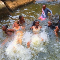 Upendo, Iva i ja smo skupa na motorinu. Redoslijedom: motorista, Iva, ja, Upendo. Jadnu Ivu zgnječili, nestala između nas, znala da je tu negdje na motoru jer smo se držale za rukice. Kako prijeđe preko većih grba i rupa tako poskočimo jedno pola metra uvis od sica. I smijemo se hahahah, a usput se i dobrano nabijemo. Jedan piki-piki, u jednom pravcu, dođe 5000tsh. Znači u oba pravca, sva četiri piki-pikija su nas koštala 40 000tsh. Dođemo do Mkuzi vodopada. Ulaz za domaće 2000tsh, a za strance 10$, tj 23000tsh. Moš mislit' kako ću platit. U roku od 5 minuta ulazimo besplatno, Upendo ispregovarala. Trčimo kroz šumarak, dolazimo do vodopada. Presvlačimo se. Hm, sad ću preko grudnjaka i mudanata obući kupaći i onda tek skinuti donji veš, ali kako ću kad mi kupaći bude mokar… a one sve bez beda se razgolile.