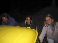 Pozvali smo telefonski prijatelje da dodju iz Skopja i da nas odšlepaju do grada jer se spuštala noć i postajalo je hladno, imali smo sve manje snage za guranje i za smijanje (“da, bili smo u planini s autom, nas 4 i auto” itd. Itd.), planina i njen uski puteljak nisu bili baš više vidljivi golim okom. Pred samim spuštanjem noći, u očekivanju nečijeg dolaska (treba oko 1 sat vožnje od centra Skopja), sreo nas je jedan stariji Albanac s fićom i počeo popravljati auto želeći nam pomoći (do it yourself majstori), ali nije imao dovoljno svijetla i alata da završi posao. Nakon pola sata mučenja ipak nismo uspjeli i odlučili smo odgurati auto do idućeg sela i pokušati ga tamo ostaviti u nečijem dvorištu kako bi bio na sigurnom dok netko ne dođe po nas. Dogurali smo ga do jedne Albanske kuće u kojoj smo, nakon što su krave spremljene u tor, dobili ponudu da stavimo auto u njihovo dvorište i da nas povedu svojim kombijem do civilizacije jer ionako idu tamo. Ljudi nas prvi put vide i puštaju nas u svoje dvorište. Toliko o tome Albanci ovakvi ili onakvi… Ukrcali smo se u Tamić zajedno sa ne baš mnogobrojnom rodbinom i krenuli. Atmosfera unutra je bila upravo kao iz filma “Za Beograd” ili kako se već zove onaj legendarni srpski film. Umirali smo od smijeha misleći na sve što nam se dogodilo, slušajuci kako sve ovo izgleda iz kuta gledanja jedne Švicarke koja kući samo treba okrenuti telefon i već dođe služba po nju, zezajući se sa svim mogućim upadicama i dosjetkama za vrijeme guranja, mojeg pentranja po strmoj kosini kako bih uhvatio bolji signal za mobitel pa na kraju imao slabiji itd. itd.