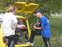 Jutro nakon, odlazak, velika akcija pospremanja kuće, vraćanja stvari na svoje mjesto. Nije problem, 9 ljudi, brzo to ide. Ali, neki su se probudili s "posljedicama" sinoćnjeg plesa – muskulfiber, glavobolja, bol u križima… Ja sam glumio medicinsku sestru i pružao masažu žrtvama plesa. Najveći pacijent, Dunga, 1.95 m, je bio i najproblematičniji. Par sati kasnije saznao sam da je svo moje mučenje oko njegovih mišića I glavobolje bilo skoro potpuno beskorisno u usporedbi sa kasnije pojedenim burekom od sira… Grrrmljh… Nakon spremanja kuće, tovarenja auta (tko kaže da samo češki turisti izgledaju smiješno? vidi sliku!), otišli smo po video zapis interviewa na jednoj drugoj lokalnoj televiziji koja se nalazi u privatnoj kući u brdu, do koje se dolazi makadamskim putem, čiji je vlasnik upravo sjekao drva za zimu pred kućom kad smo mu se javljali da dolazimo, koji inače sam čita vijesti itd itd. Nakon toga je uslijedio – nogomet!