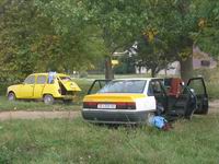 Srijeda je donijela još jednu pomalo neočekivanu blic avanturu. Ne planirajući, završio sam na Vodnu, brdu iznad Skopja (kao Sljeme za Zagreb, recimo) i tamo morao preskakati žičane ograde, zidove, pentrati se po velikim drvenim ljestvama upitne izdržljivosti, provlačiti se kroz uzane procijepe, balansirati na 5 cm širokoj gredi na 4 metra visine itd. itd. Eto, živ sam, samo malo prašnjav, khm, khm. Popodne smo otišli registrirati već dobro nam znani žuti Porsche sa slijedećom taktikom: pošto nema šanse da prođe tehnički pregled iz prve, hajdemo ga ipak odnijeti tamo pa da nam kažu šta ne valja, kako bismo ga popravili i pokušali ponovo. I odosmo tamo, bez stražnjeg branika, sa polumrtvim akumulatorom i još puno toga (bar smo tako mislili), kad nam čovjek sa pregleda procijedi kroz zube: parkirajte auto tamo daleko, kod kamiona, vratite se ovdje da vam potpišem i da vas više ne gledam!!!! I da ste namontirali taj branik, vidjeti ću vas ja po gradu, zapamtio sam vas!!!!! Smijehu nije bilo kraja, čuđenju još više...