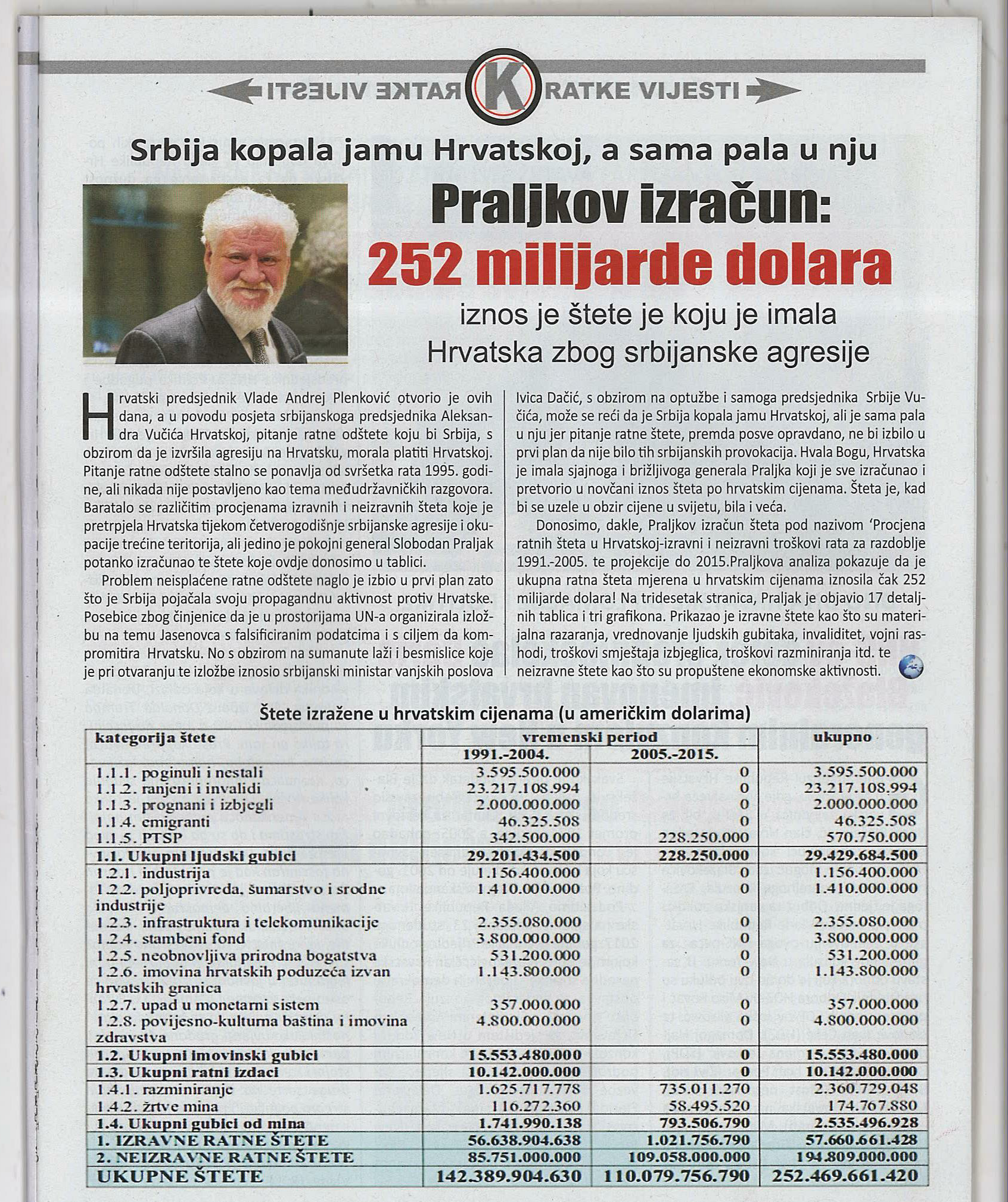HRVATSKA JE IMALA ŠTETU OD 252 MILIJARDE DOLARA ZBOG SRPSKE AGRESIJE Hrvatski tjednik, 15.02.2018 |