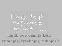 I to je to i onda se više nismo dopisivali, ili sam mu dosladila ili nije imo para al j amislim da je ovo prvo. Al da bi stvar bila pogoršana, [B ]ja saznam da je KRETEN ANTE ŠOLA NJEGOV BRATIĆ[/B]! I ko da mi to nije za ubit se, on je sve sazno! Al dobro, kaj onda. I imali mi informatiku i htjela ja objavit post sličan s ovim sam sa još nekim stavarima i bila je neka spika. I Zubak meni reko kao neš ''daj mi malo mobitel da neš vidim'' ja naravno nisam dala, jer znam šta će radit i tak i onda je Mia {naravno, ko drugi} rekla evo ja ti dam svoj mobitel daj ti meni svoj. I sad je bila spika ko se s kim dopisuje i pogađali, Babić i Zubak skim se ja dopisujem. I Šola reko, ja znam! I onda sam ja otišla nekaj vidjet kod maše i Šola reko Zubaku, i onda je Babić ''pogodio'' i sad oni znaju. I sad se Mia zgrozila kad kao, Babić,Šola,Zubak znaju s kim se dopisujem a ona ne... Ma grozota.... ma nek se goni, znaš kam! Ide mi na jetra! Mene je ful zapostavila i onda se čudi kad ja njoj nekaj odbrusim! Ajde, dobro, dobro. Al znaju Maša, Lea i Danći. I Maša rekla Kalićkoj i Gudašićkoj, a Zubak je reko Miji! Pa ne kužim, kud baš njoj?!?!!? Ma fakat, a Maša je morala Gudašićkoj? Ko a ona nebu nekom rekla........ I tak bilo Vam to. I taj dan u školi opet Maša napisala slatka mala + hrvoje pernar. I idem ja opet iz svlačionice i dođe meni Šola, kao da se ovaj nekaj kao ljut zakaj je opet napisano na klupi mala slatka+hrvoje pernar. I onda sam ja njemu rekla zato i zato, i da si bratiću veli to i to. I iidemo Danći i ja i sretnemo njih i mi se tam posvađali {Hrvoje & JA}! Dere se on na mene, ja na njega.... I tak, htjela sam ubit Mašu! I sad ju stalno na hodnicima, nekj lupam i tak, ajde mislim da je ovo dosta velik post!