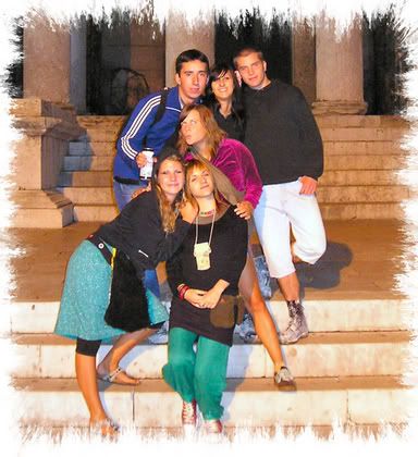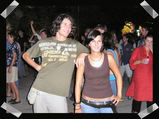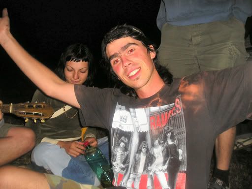 Nakon filmova smo išli plesat tamo na trg, ispod one volte... i super mi je bila muzika i atmosfera... i oni volonteri ludi, svi ošišani na irokeze, onako počne neka stvar, a oni svi šake u zrak i skaču ful nabrijani... Heh, i plesala sam s Demirkom valcer, i baš smo najljepše plesali :) joj, i svi ljudi veseli, plešu, piju, sprdaju se.... ma jako jako lijepo.... i onako zora sviće, i ona magla predivna kao neka pjena posuta po onoj dolini... btw, na ovoj fotki Đana heh odmara, a ja sviram gitaricu.... :)