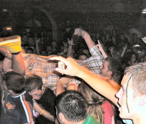 Pasi su dobro odradili svoj posao.... Nije mi baš bilo do skakanja, pa sam sjedila sa strane, pokušavala uhvatit koju dobru fotku.... al mi baš i nije uspijevalo... ma nije mi se dalo ić tamo nasred rulje, još da me netko klepi nogom po glavi i odalami mi aparat... Al super mi je bilo gledat te ljude... Svi ful uživljeni, kaos totalni.... Evo i posljedica... ... Njih 15 se popelo na stejđ, ljudi grabe mikrofone, pjevaju... ma meni to tako zakon... baš je neka super atmosfera na tim Pasima, svaki put.... bez obzira što su zadnje vrijeme ful često svirali, i stvarno je moglo doć do nekog zasićenja... al meni ih je uvijek gušt poslušat...