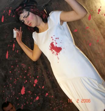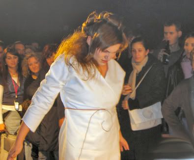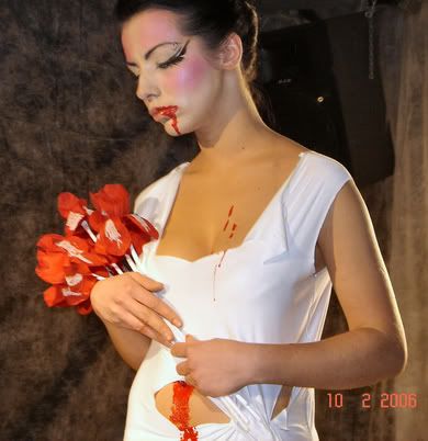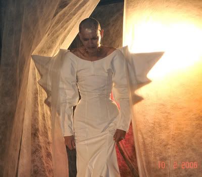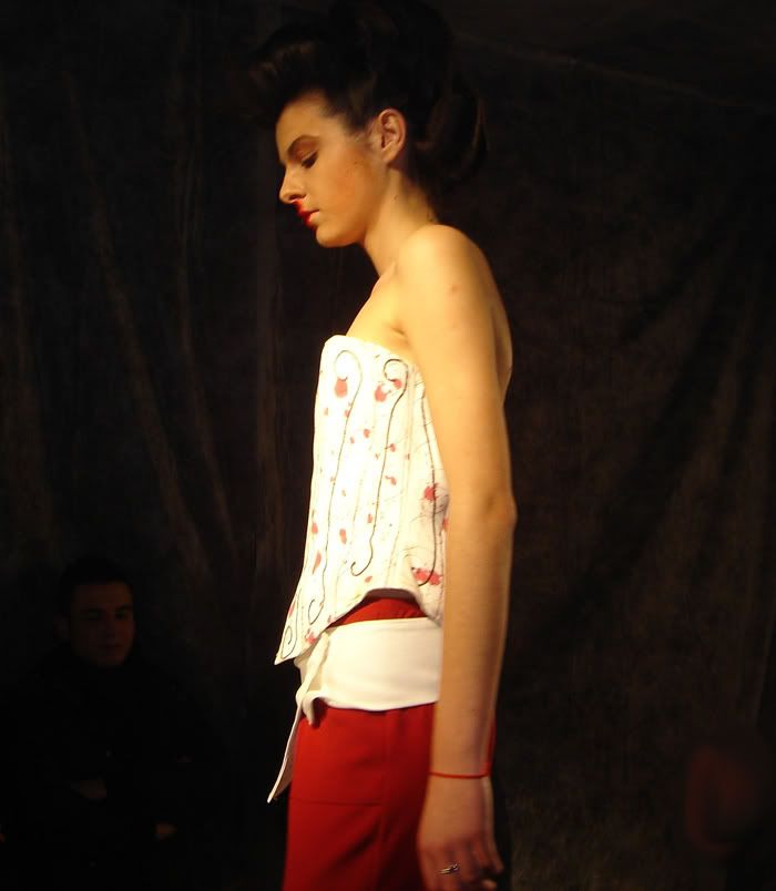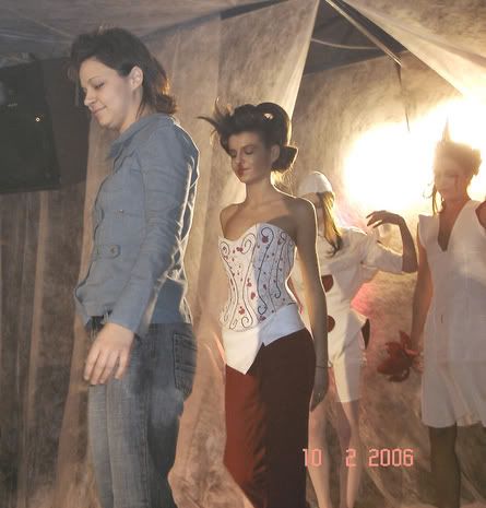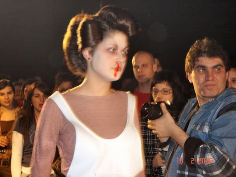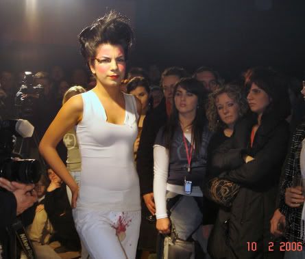 A u petak ( 10.2. ) je u Palachu održana jedna modna revija na kojoj je Tajči Čekada predstavila svoje šivače sposobnosti i dokazala publici da raspolaže bujnom maštom i originalnim idejama. U kolekciji pod nazivom " Diplomatska oprava za pregovore među vrstama " , proljeće-ljeto 2006., glavnu ulogu igrale su isključivo crvena i bijela boja, a za frizure modela bio je zaslužan " Studio Heaven ". Danijel Domika, vizažist modne revije, pobrinuo se da šminkom modele predstavi u pomalo zastrašujućem izdanju, tako da se " krv " koja je curila niz lica modela dobro uklopila uz crvene fleke na bijelom keperu kojeg su modeli nosili. A uznemirujućoj atmosferi uvelike je pridonijela i muzika koju je posebno za ovu priliku skladao Josip Maršić. Ja bih samo malo prokomentirala modele i njihovo ponašanje na pisti... Naime, većina je dobro odradila svoju ulogu, ali nekolicina djevojaka je pistom prošetala onako sa polu-smiješkom na licu, karakterističnim manekenskim hodom, okretima, i poziranjem fotografima pri svakom stajanju... Što, po meni, nikako nije pasalo u cijeloj toj priči.... Evo, npr. Stefi se baš kako treba odgegala po pisti, dok je, recimo, Krešo, po mom skromnom mišljenju, ipak mrvicu previše odugovlačio... Ne znam dal ja na to gledam previše subjektivno, budući da me je nekako strah tog čovjeka, ne bih znala zbog čega...