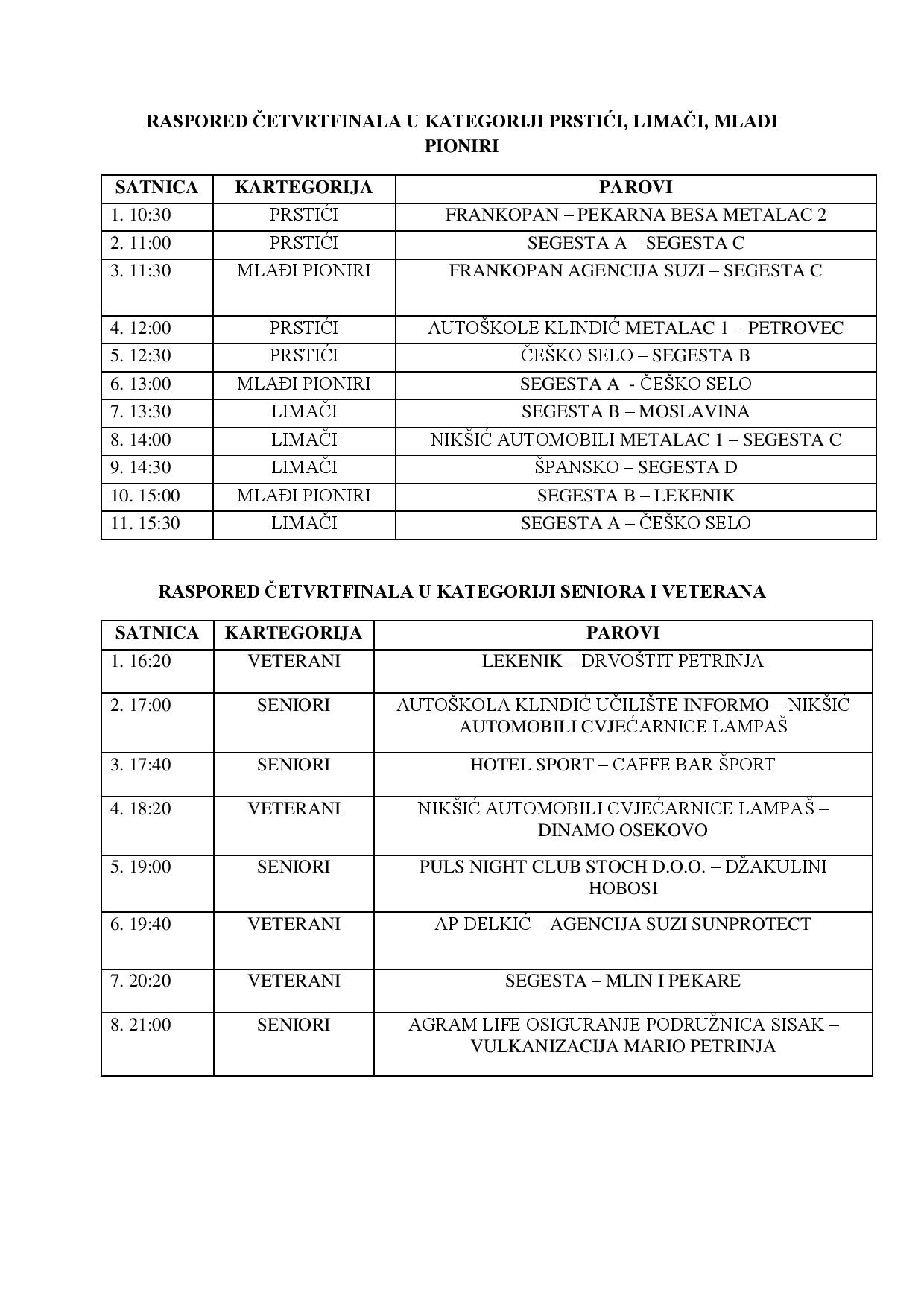 Raspored utakmica 13.1 nedjelja POLUFINALA SVE KATEGORIJE