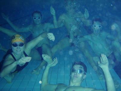 Nedjelja ujutro je bila rezervirana za zajednički plivački trening. Zbog vaterpolske utakmice, zadnji i teži dio smo morali napraviti u malom i (pre)toplom bazenu, tako da smo na kraju izgledali ko Indijanci. Evo par slika da vam dočaram kako izgleda jedan od takvih treninga.