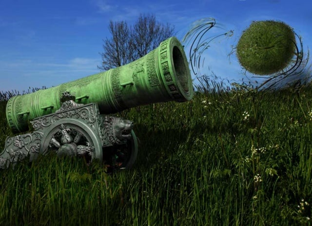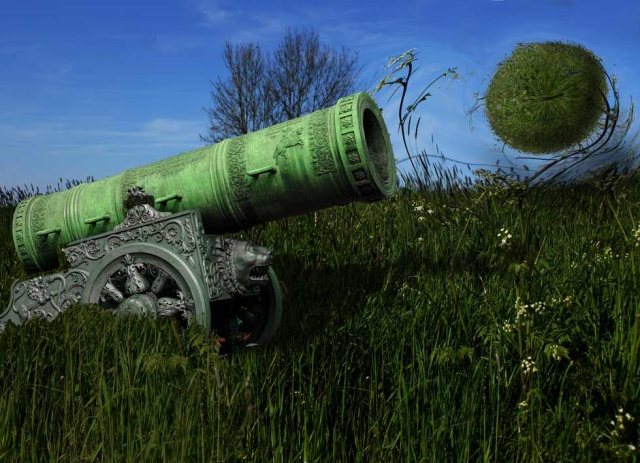Pocne se najobicnijom fotkom, ova cak nije nit obradjivana ('razvijana') pre upotrebe, vec je koristena sirova, ako je kliknuta: Najvazniji deo vezbe je ucenje ovog filtera koji pejzaz ili bilo koju snimku otvorenog prostora moze pretvoriti u loptu. Obicno je cilj postici sto pravilniju kruznicu, ali ja sam to malo izmenio da bih dobio dinamiku kugle koja leti. Doticna lopta me je podsetila na topovsku kuglu u letu, pa sam osmislio dalju nadogradnju buduce slike - ispaljivanje iz topa. Nazalost, nisam imao moju fotku takvok starinskog topa ('Bombarde') pa sam na internetu preuzeo sa wikipedije ovu snimku 'Cara topova' iz Kremlina, Moskva: https://en.wikipedia.org/wiki/Tsar_Cannon/Tsar_Cannon Prva gruba montaza, na pozadini koja je opet ona ista prva fotka od koje sam napravio travnatu kuglu: U sledecoj fazi sam poceo dodavati sve vise instumenata za bolju uklopljenost delova slike nastalih od posebnih slika: Zavrsna dorada, sa naglaskom na animaciji pucnja. Posto rad nije pravljen za neku izlozbu ili publikaciju, zaustavio sam se na ovoj fazi obrade, sat vremena je sasvim dovoljn o ulaganje u pripremu casa, pogotovo sto sam ulozio jos par sati na pravljenje filma za You tube, gde studenti mogu da prate svaki deo obrade: I na kraju, mogucnost da se fotka sagleda u malo vecoj rezoluciji (ovo je ipak redukovana na jednu desetinu piksela koje original poseduje) Naravno da je 'prica' u ovoj slici mogla dalje da ide u pravcu - ko je taj koji top ispaljuje, efekti pucnja na bazi vatre i dima i slicno. Mozda neki drugi put... . |