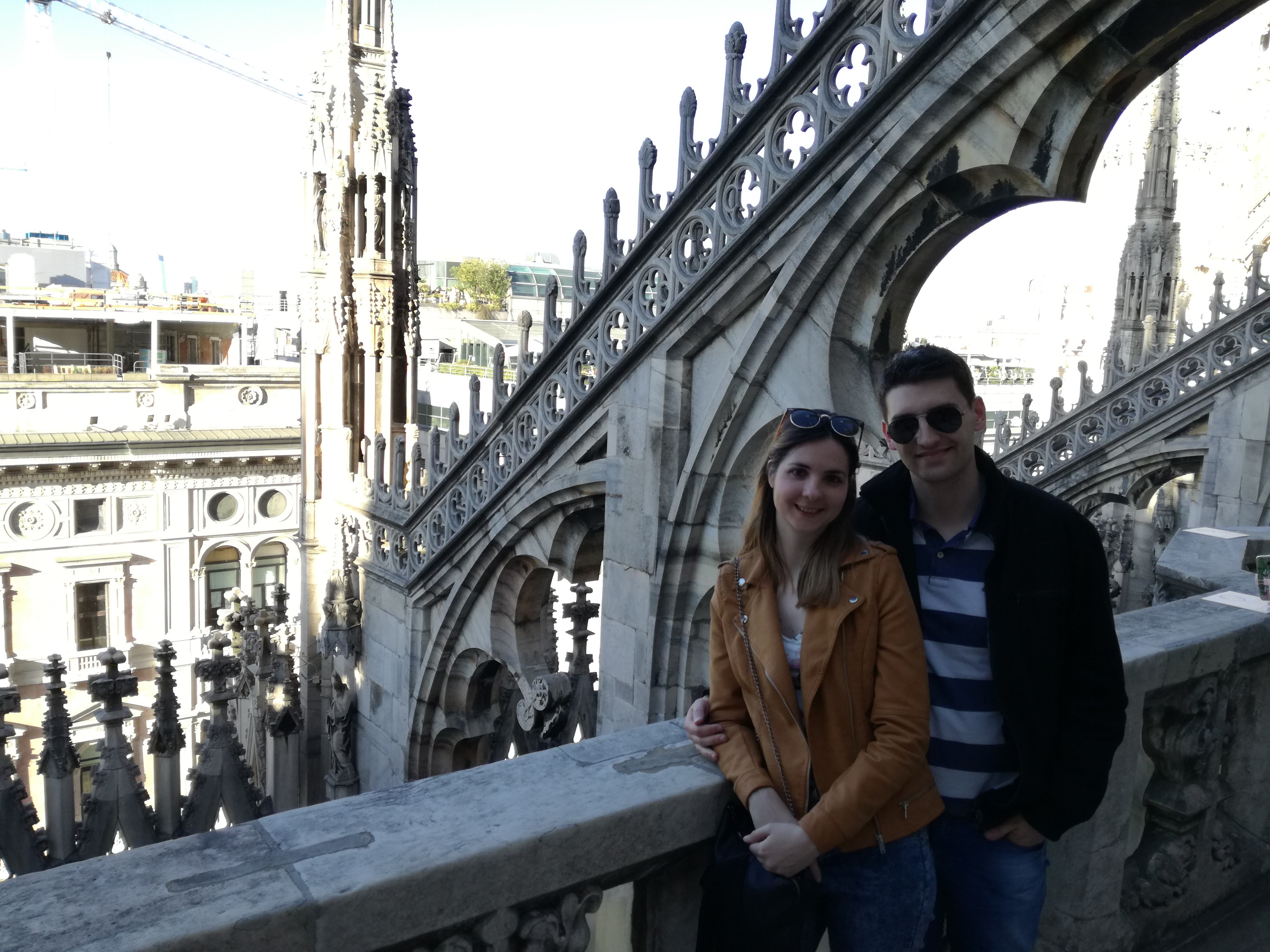 Pošto oboje volimo putovati, plan nam je bio otići na neko putovanje kad dobiješ ponovno godišnji...Mislili smo se dugo gdje bi išli i na kraju se odlučili za Portugal...Ja sam trebala ići u Portugal s faksom, ali to je propalo...Na kraju, još mi i draže da ovako ispalo i da sam s tobom išla...Pošto smo kretali iz Zagreba dogovorili smo se tamo naći...Prije puta smo se našli s tvojim prijateljem koji se preselio u Zagreb i njegovom curom...Popili smo piće i potom krenuli na bus...Polazak je bio kasno navečer...Prvo smo išli busom do Milana gdje smo prespavali jednu noć, a potom avionom od Milana do Porta...Stigli smo ujutro u Milano i kako nismo mogli odmah ući u smještaj otišli smo prvo malo razgledati stadion San Siro...Nakon tog smo išli u restoran nešto pojesti pa u smještaj...Kratko smo odmorili pa se uputili u centar grada...Prvo što smo vidjeli kad smo izašli iz metroa je bila katedrala Duomo koja predivno izgleda...Popeli smo se na vrh katedrale i pogled je odličan...